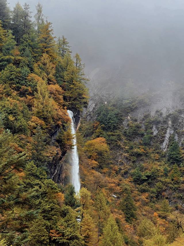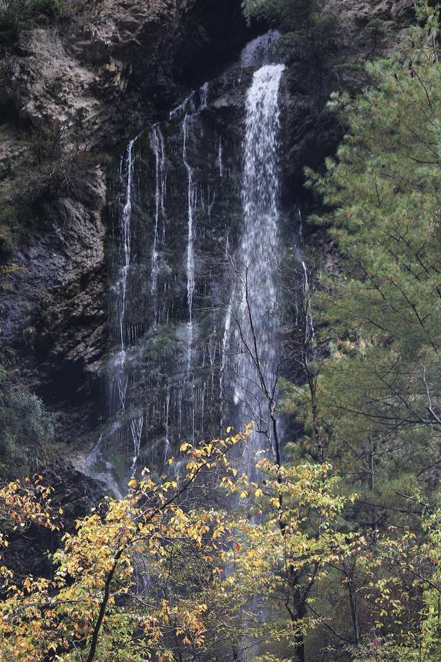 深秋时节进沟,峡谷里已满是清寒,两侧峭壁陡立,将天空裁成窄窄的一线,沿着栈道深入,脚下是潺潺流水,头顶是几挂飞瀑,水流执着地从崖壁飞溅而下,水珠清冷,更显得这峡谷幽邃而险峻,工作人员说过段时间瀑布会冻成冰瀑,想必更为壮观。