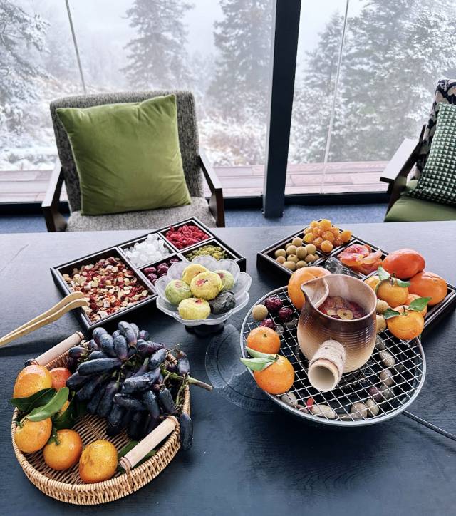 进去后听说雷古山已经冰天雪地银装素裹,临时决定再购票乘坐索道上雷古山,不得不说这是一次惊喜的决定,上去的过程中仿佛经历了一场季节的瞬间更迭。缆车平稳攀升,窗外的色彩从山腰斑斓的秋——那深深浅浅的黄与赭石,逐渐褪去,取而代之的是一种纯粹的、浩大的白。当缆车冲破云层,一个银装素裹的世界豁然眼前。山峦覆着厚厚的积雪,波澜壮阔,最奇妙的是,秋日竟遇白雪皑皑,时间仿佛在这一刻慢了下来,天地间只剩下这片静谧与洁白。上山后我们早已手脚冰凉,出索道口一阵咖啡香瞬间将我们包裹,旁边的“官鹅之恋”咖啡馆火热营业,这里是拍照观景的绝佳之地,需要消费入座,很幸运的遇到了冬日限定体验火锅和围炉煮茶,经小伙伴一致决定选择了围炉煮茶。在高山之巅与三五好友围炉而坐,炉上茶壶咕嘟作响,热气氤氲,我们捧着温热的茶杯,聊着山上的雪,峡谷的风,让冻僵的四肢慢慢回暖,疲惫也在这份闲适里悄然融化。